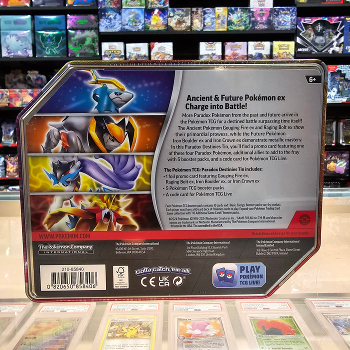More Paradox Pokémon from the past and future arrive in the Pokémon TCG for a destined battle surpassing time itself! The Ancient Pokémon Gouging Fire ex and Raging Bolt ex show their primordial prowess, while the Future Pokémon Iron Boulder ex and Iron Crown ex demonstrate metallic mastery. In this Paradox Destinies Tin, you'll find a promo card featuring one of these four Paradox Pokémon, additional allies to add to the fray with 5 booster packs, and a code card for Pokémon TCG Live.